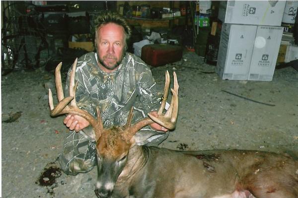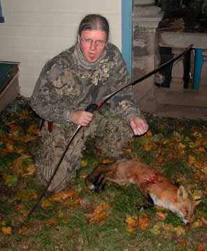56lb 58" Ron Laclair Super Shrew take down bow in Autum grey. This fox came in stalking a foam deer head I had out as a buck decoy. 21 yds right through the heart and the compressed cedar arrow with the 125 Zwickey head was devastating. This large male topped the scales at 13 + pounds. Huge!